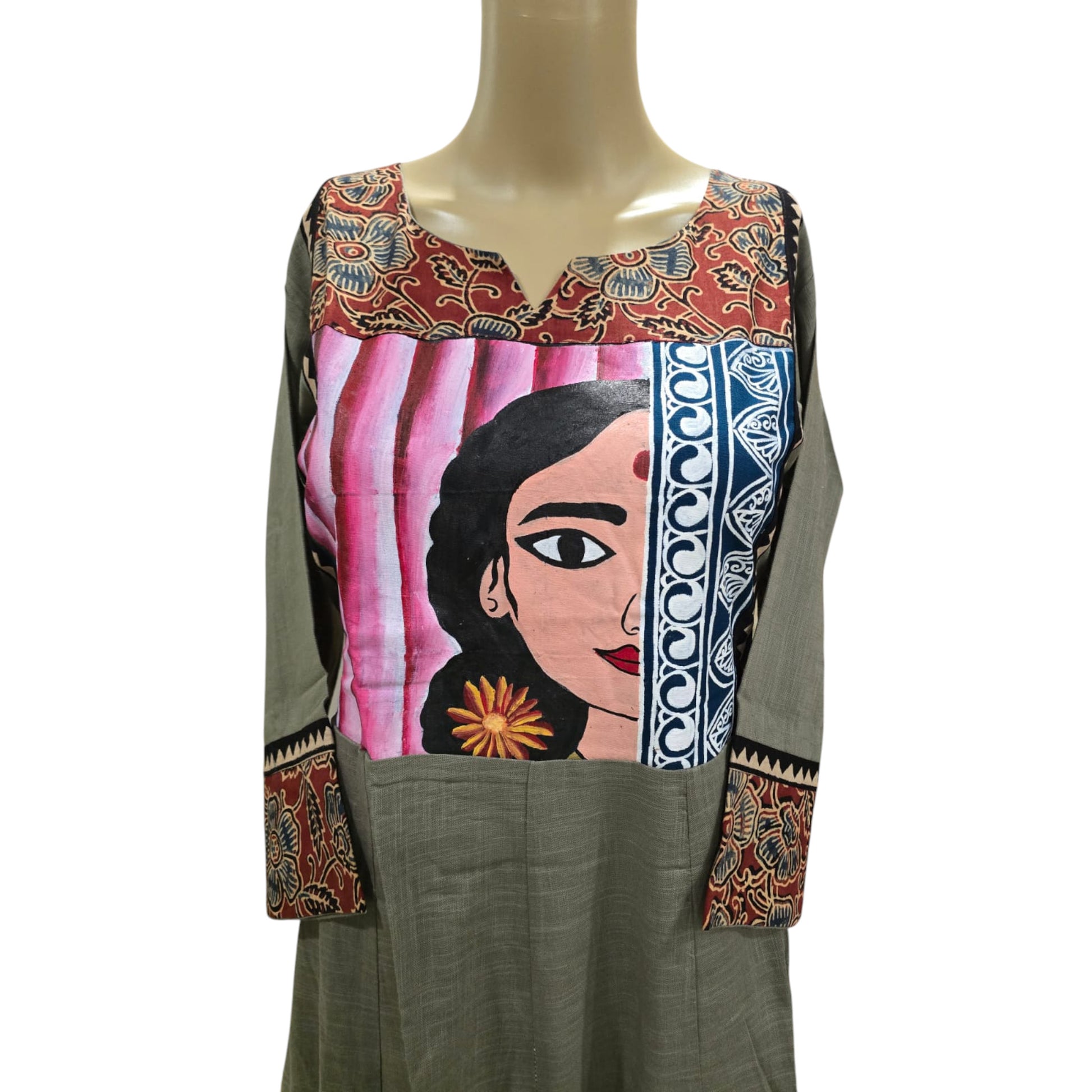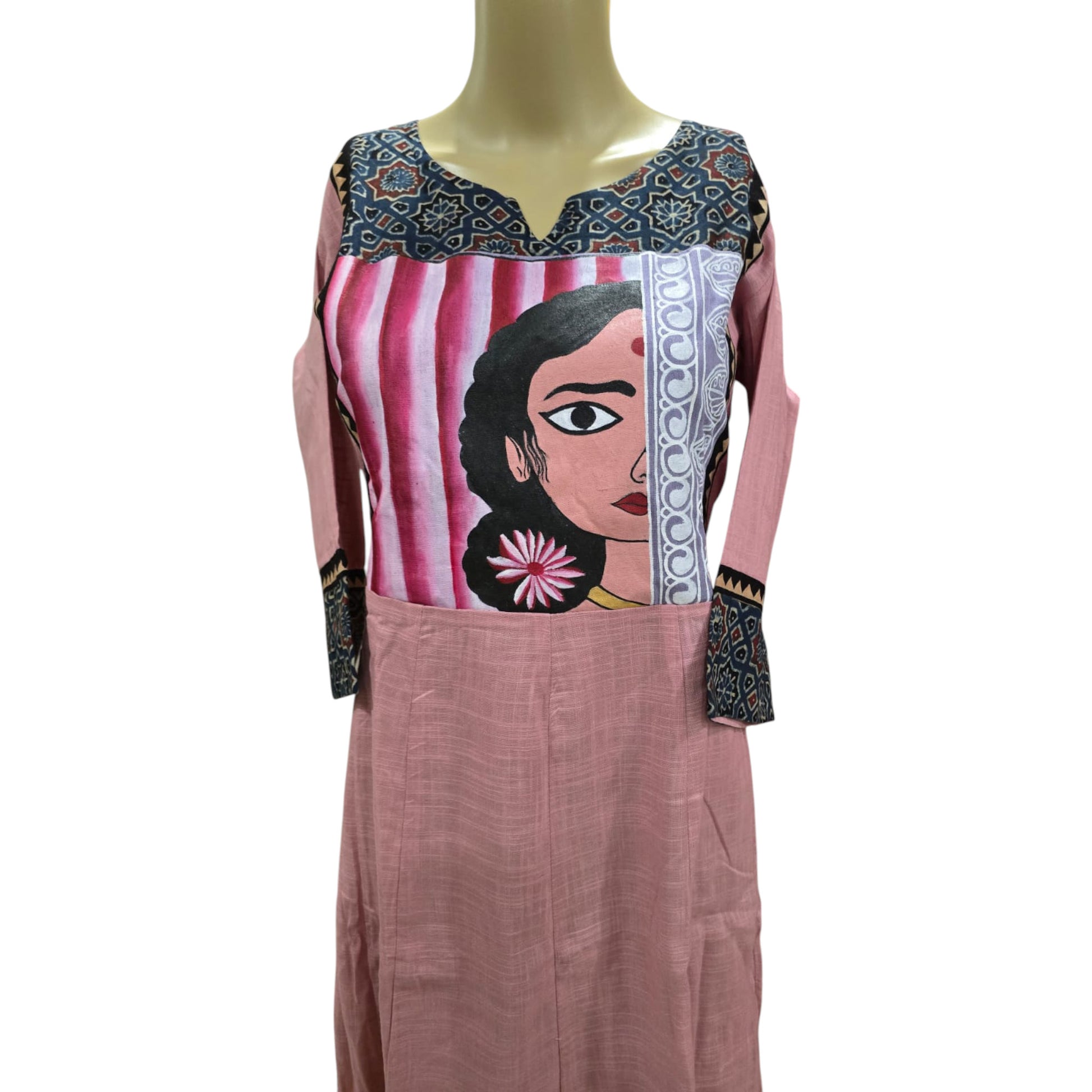 This cotton one piece combines comfort and style in two elegant colors—pink and grey. It features a hand-painted yoke and ajrakh patchwork detailing on the neckline and sleeves, adding a unique handcrafted touch. This single-piece garment is perfect for a casual yet refined look.