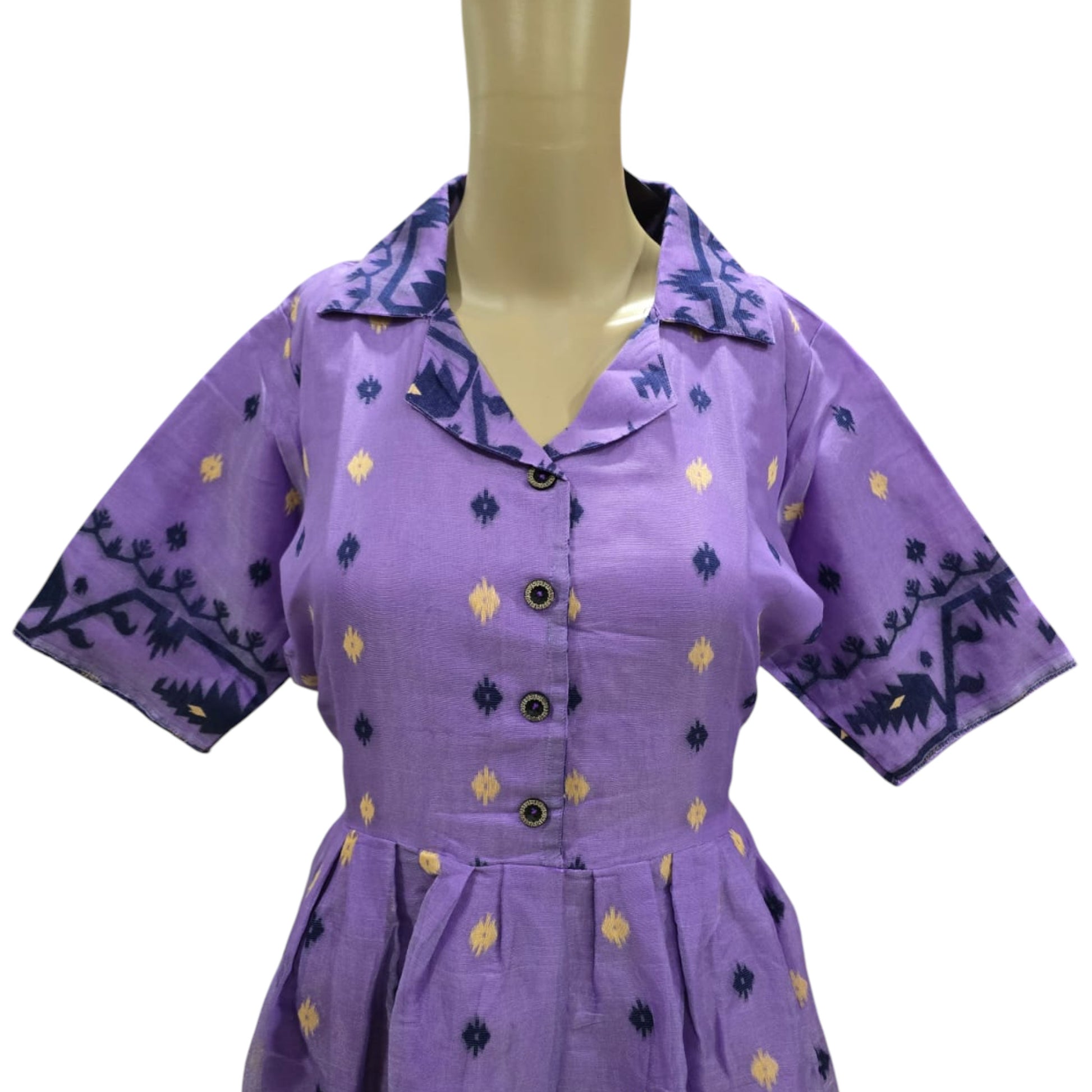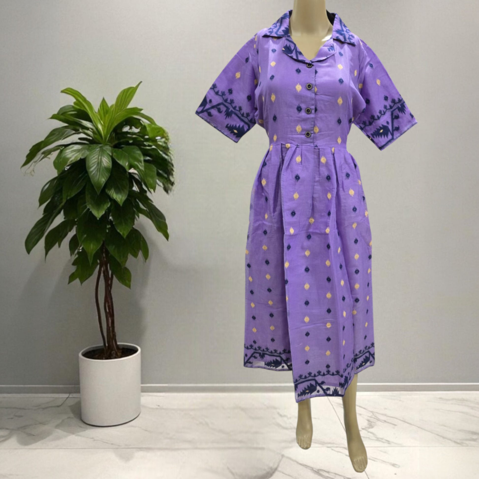 This Jamdani one-piece in a soothing lavender color features a comfortable lining and a stylish collar neck. Designed with a practical side pocket, it combines traditional fabric with everyday convenience for effortless elegance.