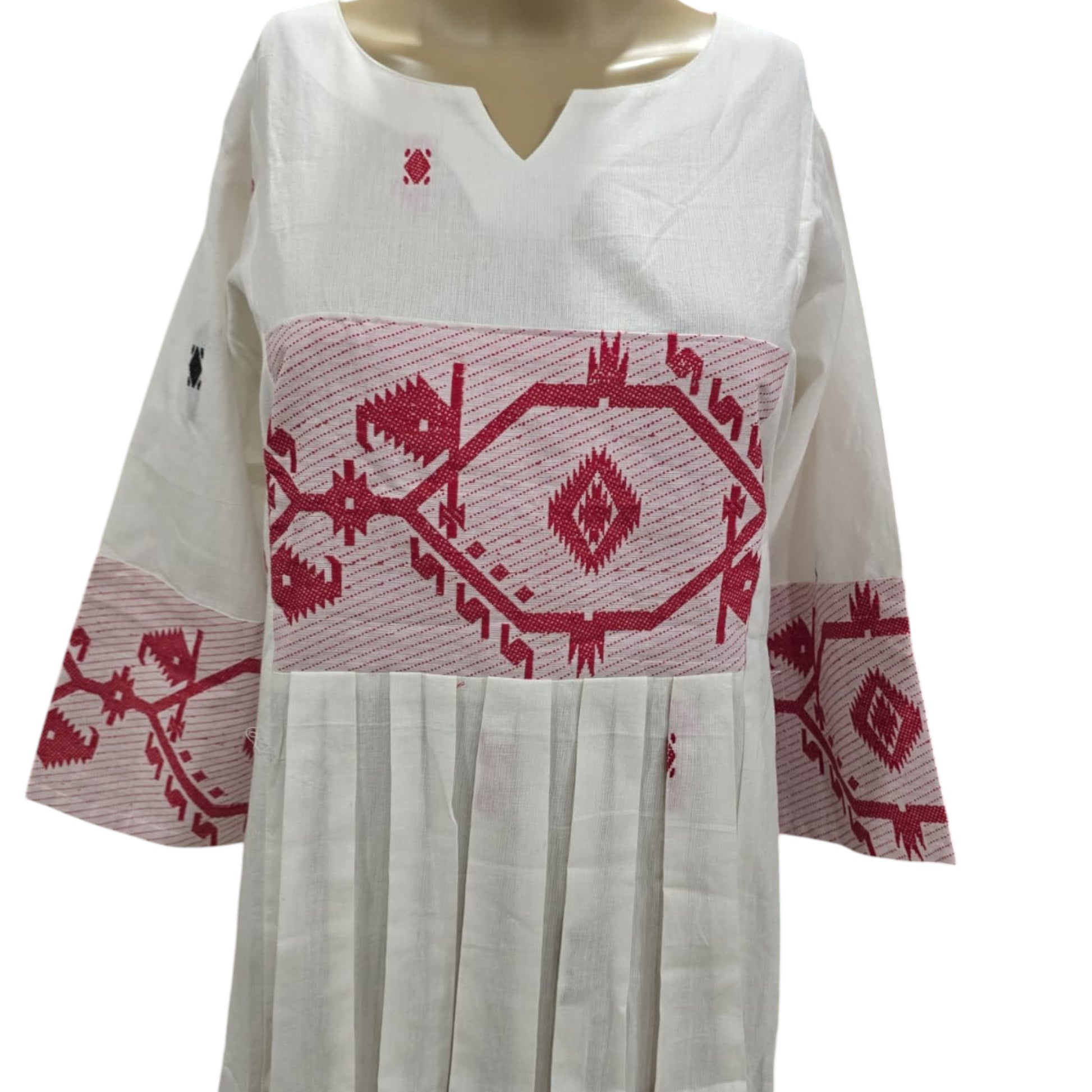 This Jamdani One Piece features soft cotton fabric in a white and red color combination. It is designed with a stylish box pleat below the yoke on the front, adding subtle texture and shape. The included pocket enhances practicality without compromising the elegant look. Comfortable and easy to wear, this piece suits everyday wear with a refined touch.