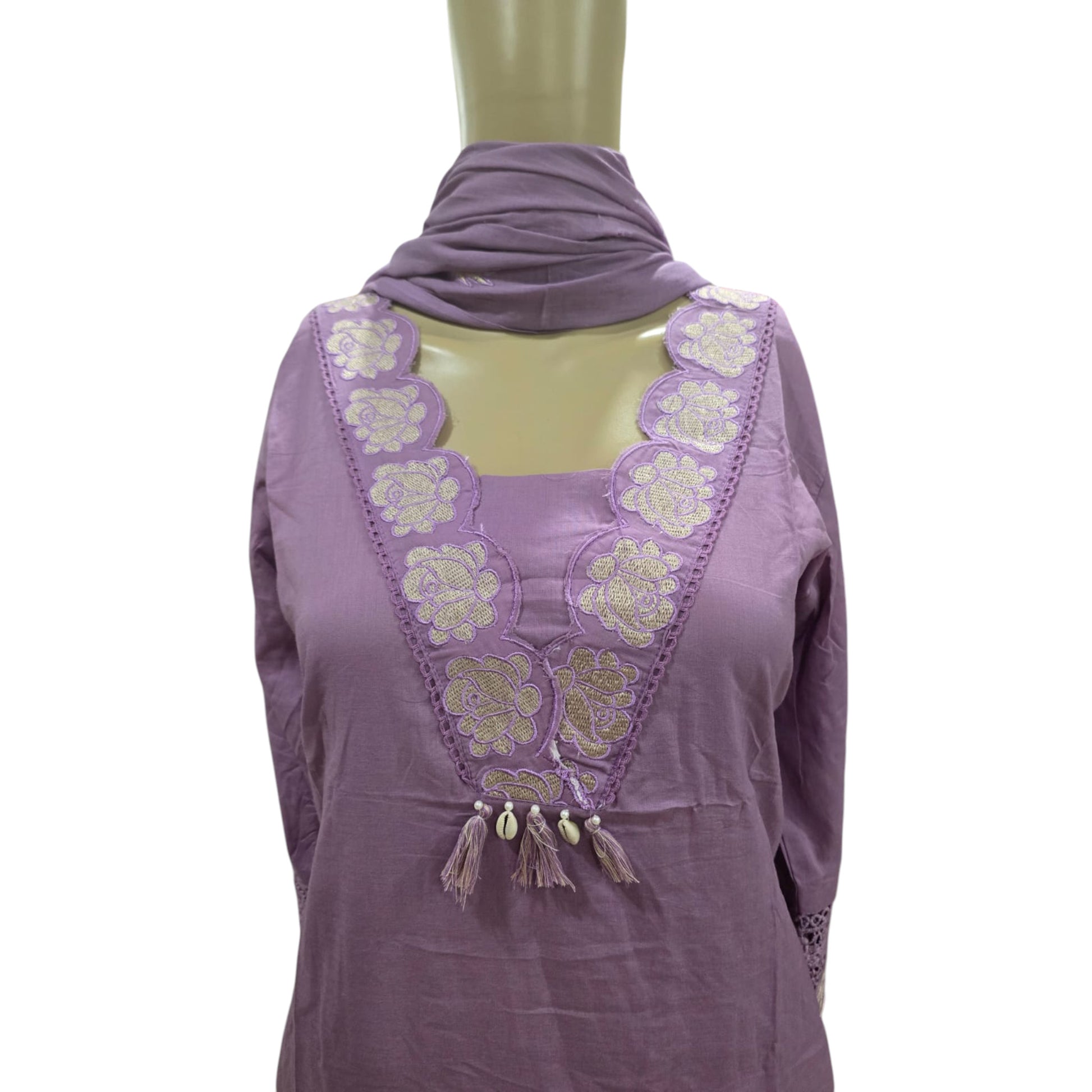 This Lavender Full Suit features soft pure cotton fabric for comfortable wear. It is accentuated with delicate thread work on the neckline, sleeves, and the bottom of the kurti, adding subtle elegance. The dupatta is adorned with small threadwork butis, while crochet lace work enhances the bottom of the pant and sleeves, completing the graceful look. Ideal for casual or semi-formal occasions, this suit combines comfort with understated style.