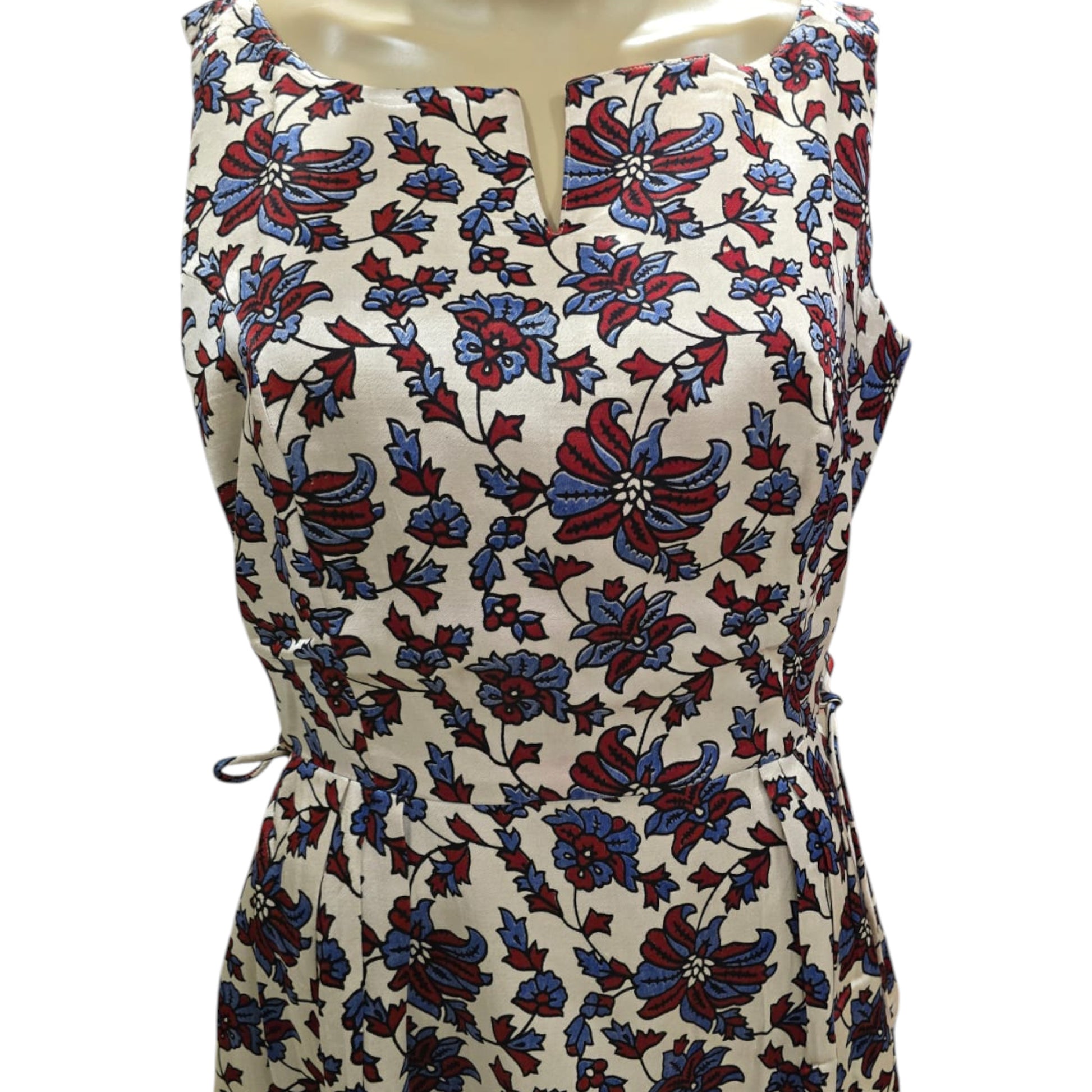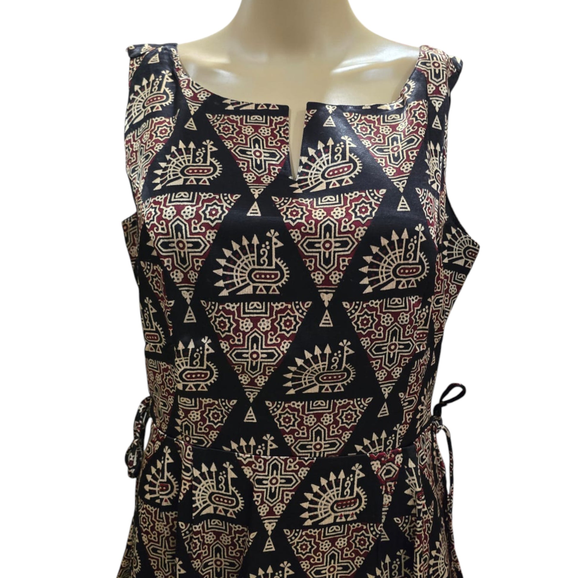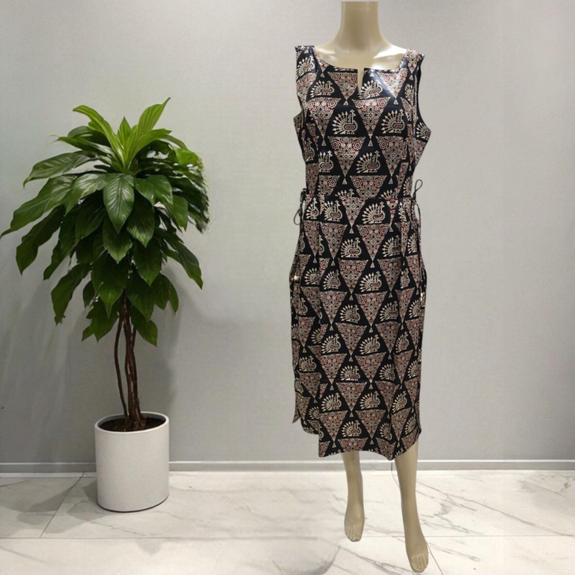 This Mashru silk one-piece features a stylish ajrakh print and a calf-length cut. Designed with a side thread to tie, it helps create a slimmer waist look. The dress includes small side slits on both sides and a convenient one-side pocket. Sleeveless with attached sleeves, it combines comfort and elegance for everyday office wear.