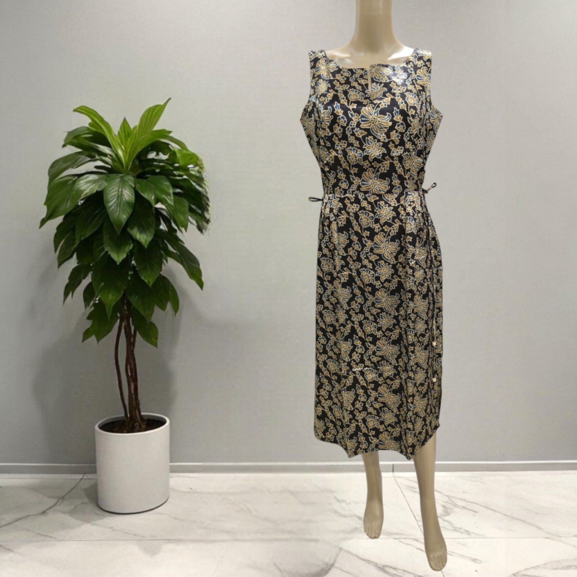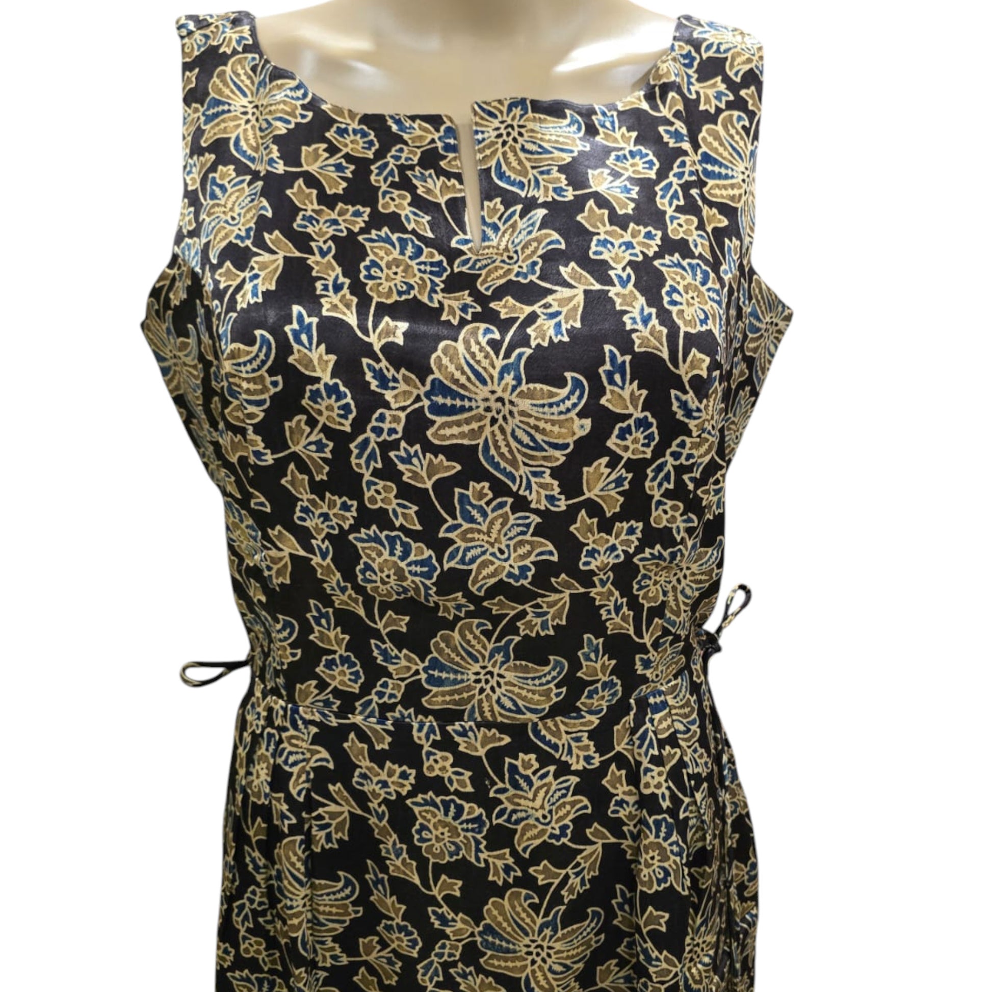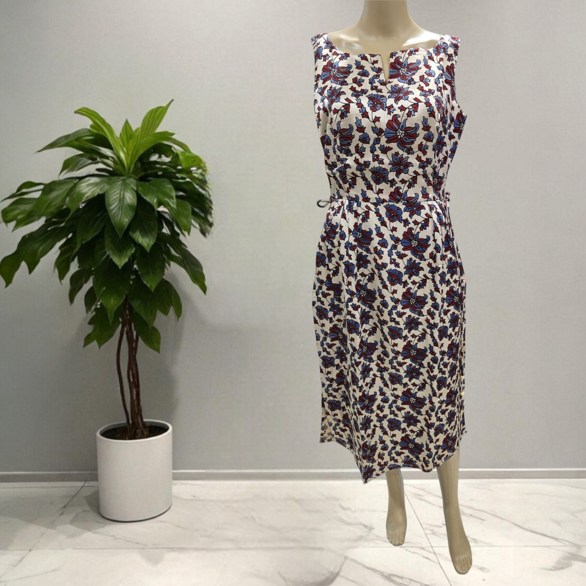 This Mashru silk one-piece features a stylish ajrakh print and a calf-length cut. Designed with a side thread to tie, it helps create a slimmer waist look. The dress includes small side slits on both sides and a convenient one-side pocket. Sleeveless with attached sleeves, it combines comfort and elegance for everyday office wear.