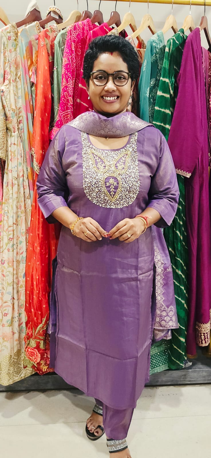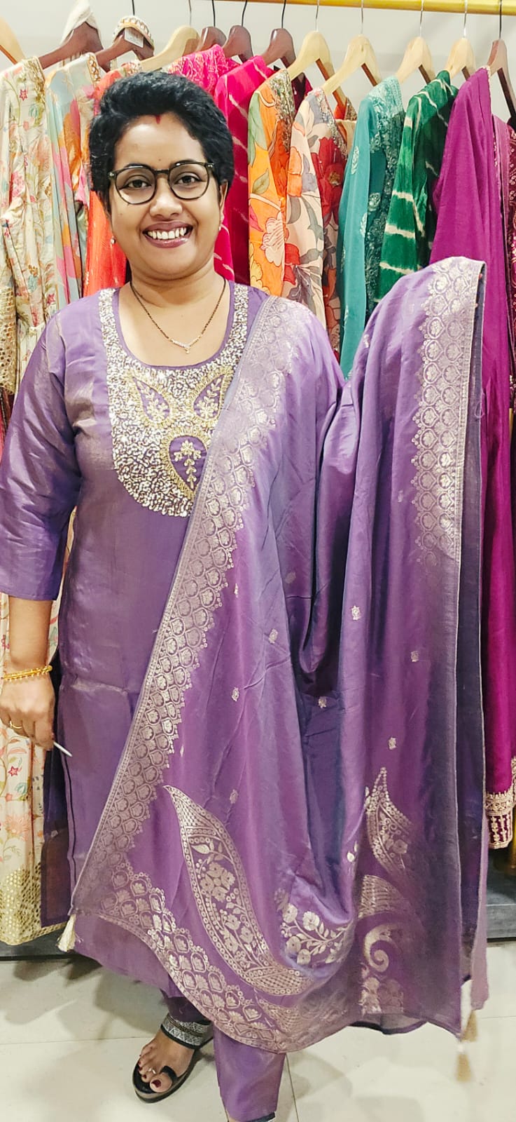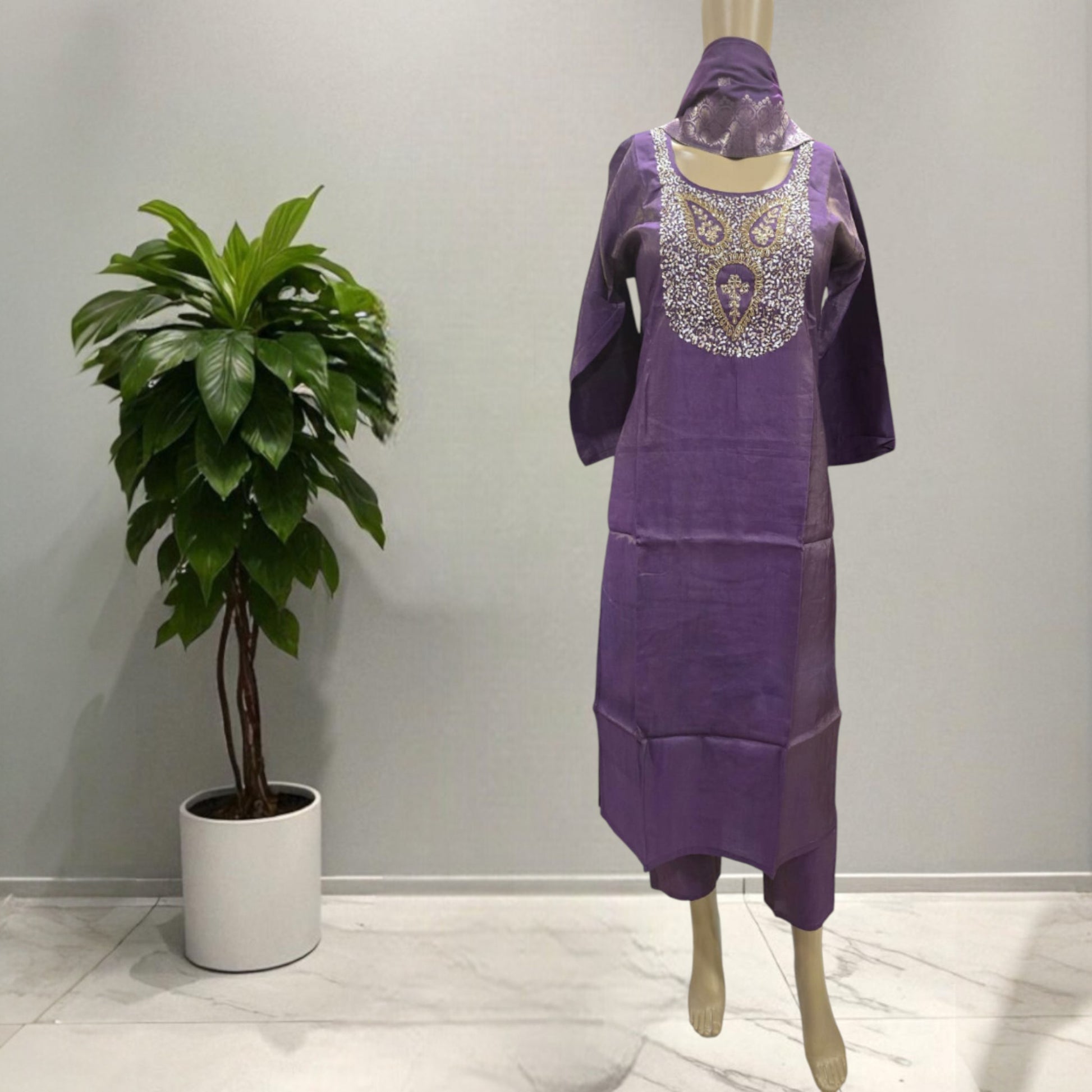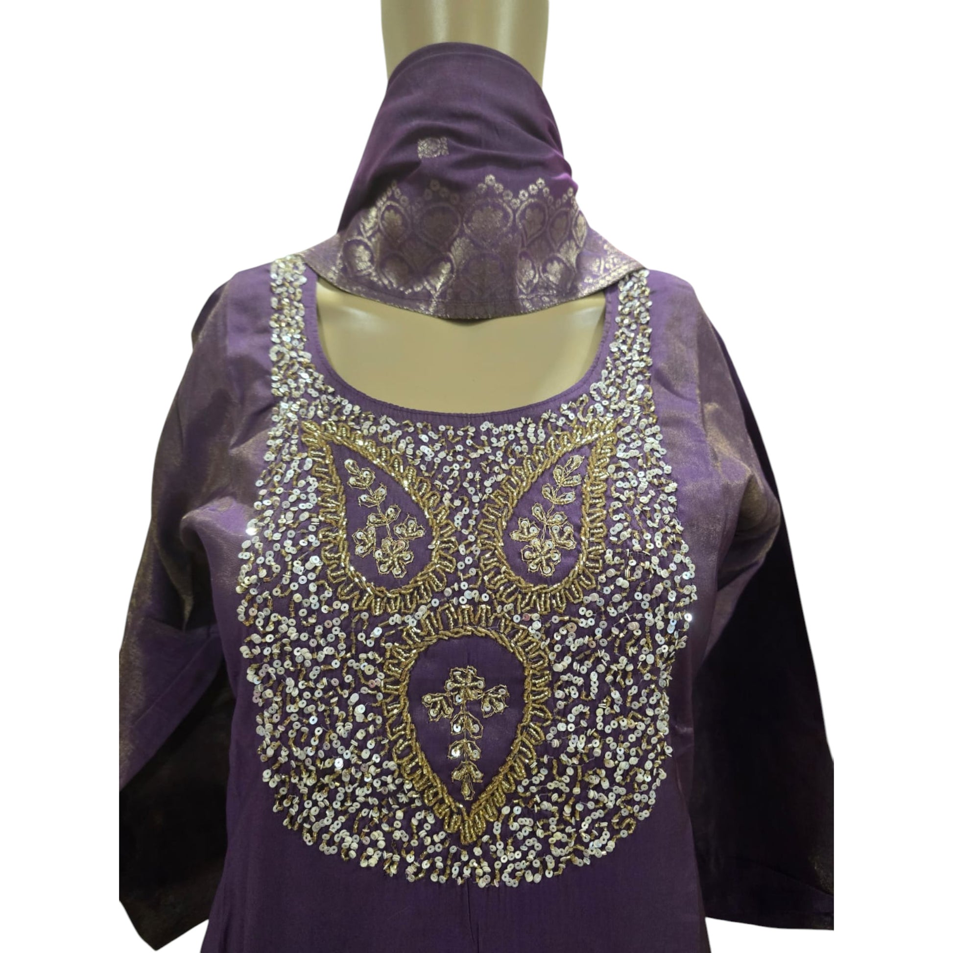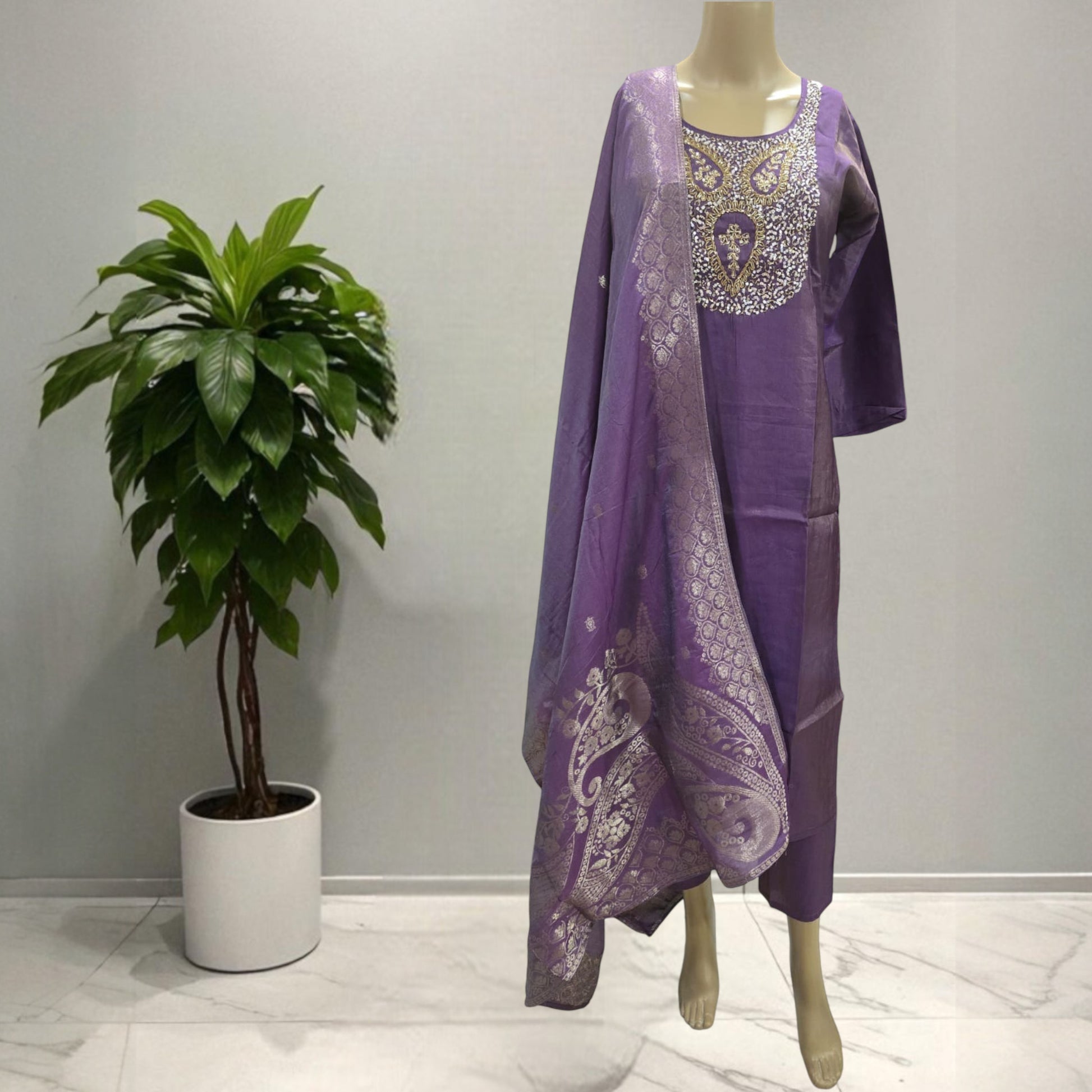 This elegant Roman Shimmer Full Suit in a rich purple shade features a straight cut design paired with matching fabric pants. The yoke is beautifully embellished with heavy beads and sequins, enhancing its festive appeal. Complemented by a classic Banarasi dupatta, this suit offers a perfect blend of tradition and style for any special occasion.