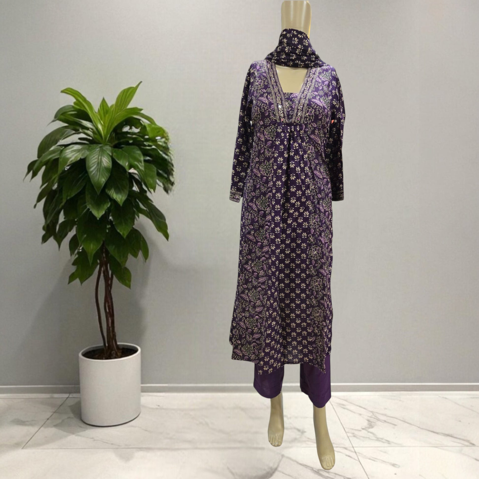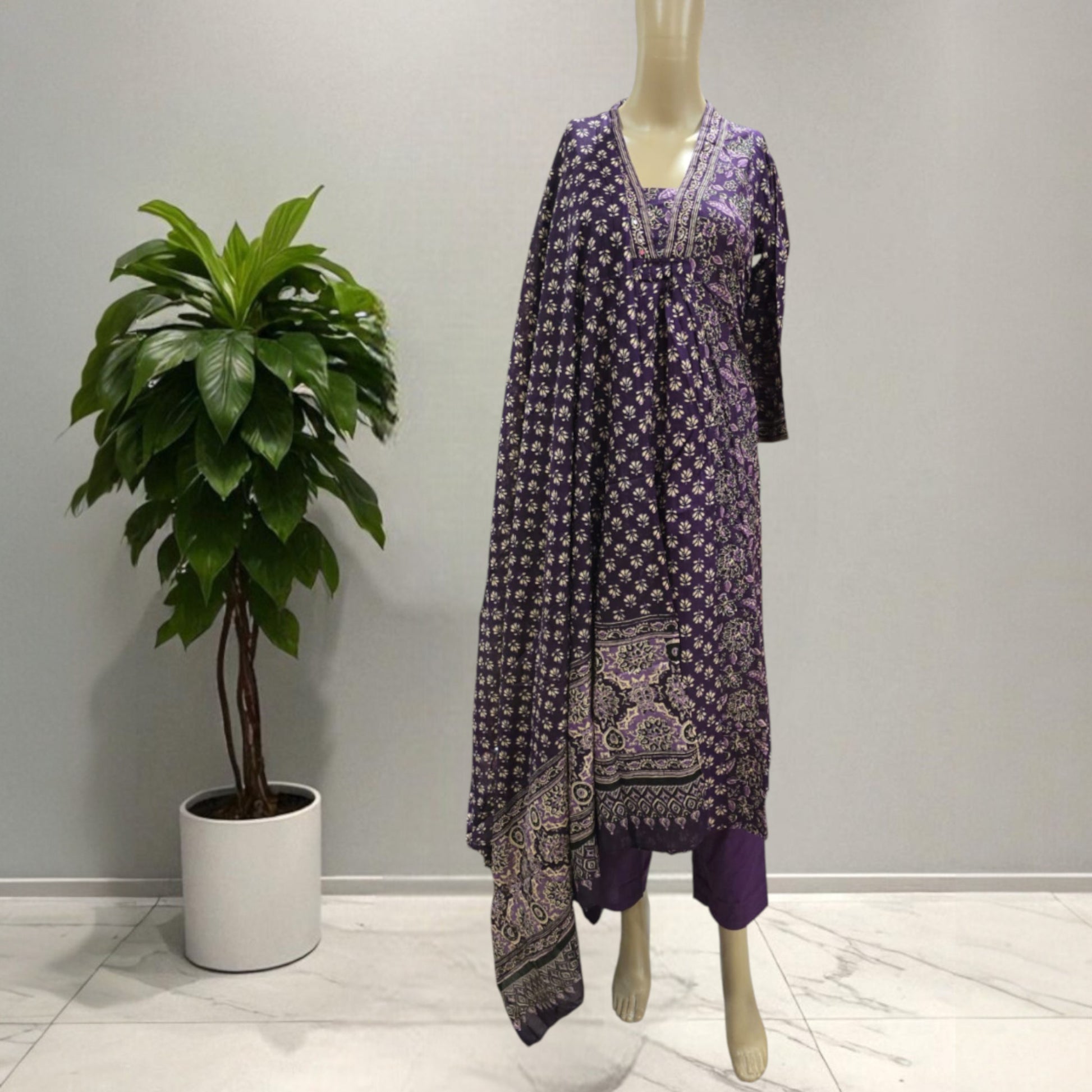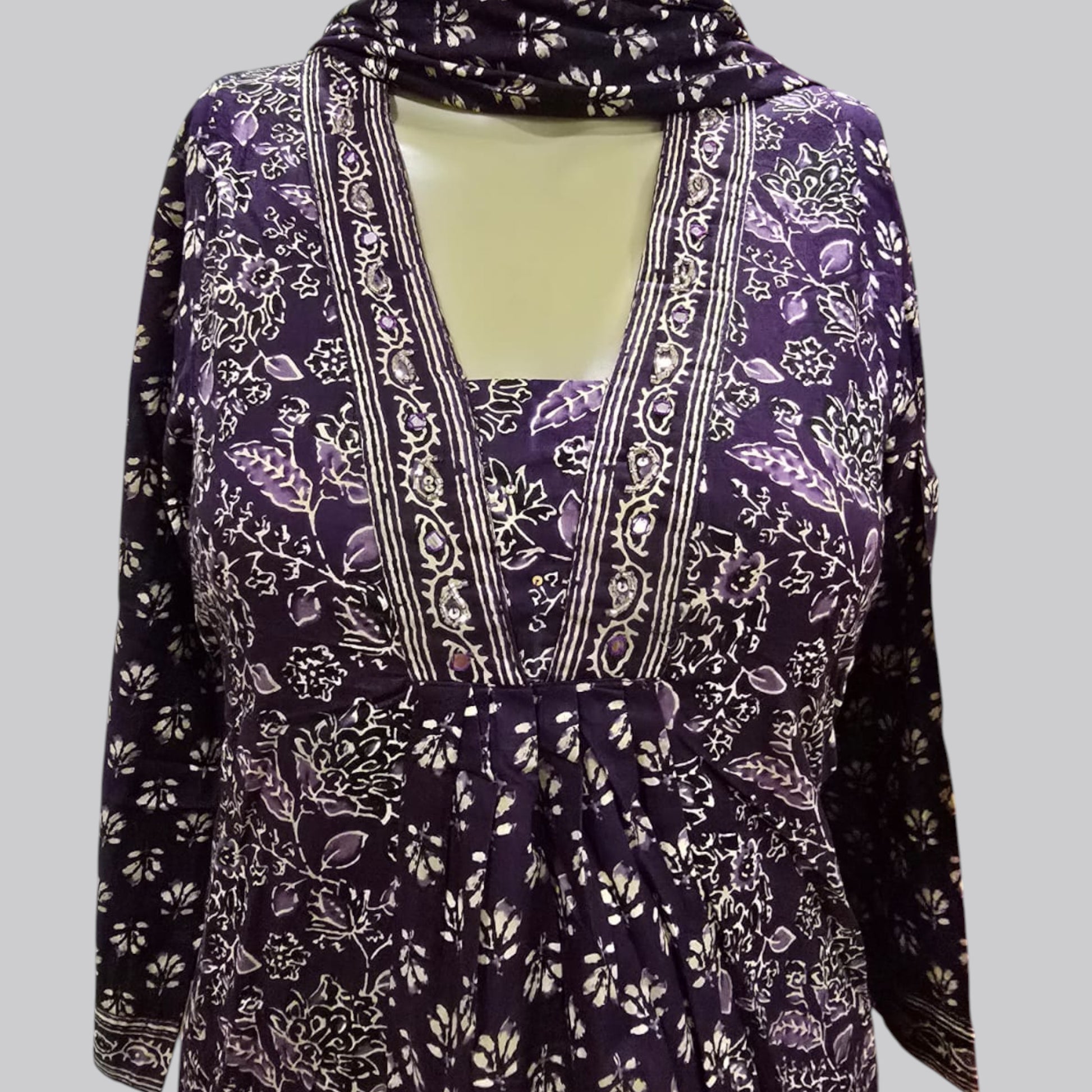 This purple full suit is made from pure cotton, offering comfort and breathability. It features an A-line cut for a flattering fit. The neckline is beautifully highlighted with delicate handwork, adding a unique touch. The floral print enhances its elegance, making it perfect for everyday wear or casual outings.